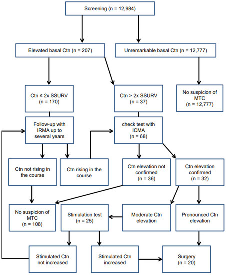 If the Ctn values were only slightly increased, i.e., within a range of twice the sex-specific upper reference values (SSURV), which is up to 20 pg/mL in women and up to 30 pg/mL in men, the next step was usually a follow-up test with the same IRMA (SELco Calcitonin, Medipan). In case of more pronounced Ctn elevations or increasing Ctn values in the further course, a serum sample was usually sent to the collaborating endocrinological practice for a confirmation test with the ICMA. Carcinoembryonic antigen (CEA) was measured in parallel. Depending on the degree of Ctn elevation, patients with confirmed elevated Ctn values either had a follow-up basal Ctn measurement 3–12 months later and/or a stimulation test, or they were immediately referred for surgery (see the flow chart, Figure 1).