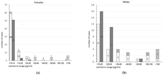 (a,b). Histograms of the distribution of the Ctn values above the sex-specific reference ranges (female patients = left side; male patients = right side). White columns: patients in whom MTC could be excluded; light gray columns: patients with confirmed MTC; dark gray columns: patients in whom no further clarification of the Ctn elevation was possible. Considering the distribution of the Ctn values, the statistical extrapolation showed that in 2 additional female patients of the 83 patients with increased Ctn values for whom no further clarification was possible (dark gray columns), MTC could be expected.