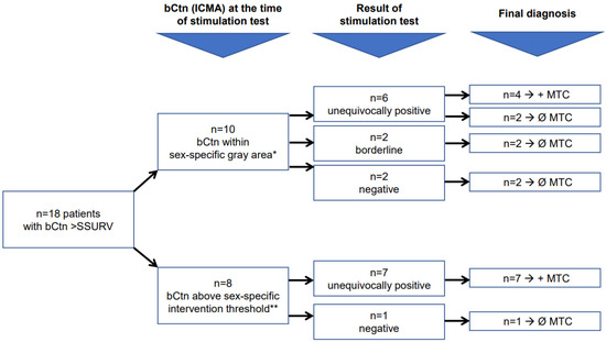To retrospectively compare the diagnostic contribution of the calcium gluconate stimulation test versus the use of basal sex-specific Ctn cut-off values, 18 patients (10 f, 8 m) were identified in whom a calcium gluconate stimulation test had been performed and either a histological diagnosis after total thyroidectomy or long-term basal Ctn (bCtn) follow-up measurements were available. The results are visualized in Figure 3 and are explained in detail in the following text.