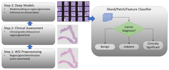Development in the last decade has seen promise in using machine learning (ML) and deep learning (DL) tools to improve diagnostic variability and provide a decision support system (DSS) to aid the pathologist and improve quality of care or treatment response [11,12,13,14,15,16]. A potential implementation of a DSS is shown in Figure 1; this study concentrates on the decision classifier. A complete implementation of a DSS will include many preprocessing steps such as region extraction, which were supported through preprocessing tiles as detailed in Section 2. Feature extraction and composition through explicit means (not implicitly derived through CNN layers) such as radiomic features and feature composition is a fertile area for improvement [17,18] but not a focus of this study. Our minimalist approach is covered in the proceeding. Recent deep learning techniques with convolutional neural networks (CNN) have shown tremendous promise in extracting non-human visible salient features from diagnostic pathological images [19,20,21,22,23,24]. Our results demonstrate that these diagnostic clues are available in local glandular structures or small patches of prostate biopsy whole-slide images (WSI). Due to the subtle nature of the features in histopathological images coupled with limited sample sizes, generalization of the model continues to be a challenge across medical centers and sources [25].