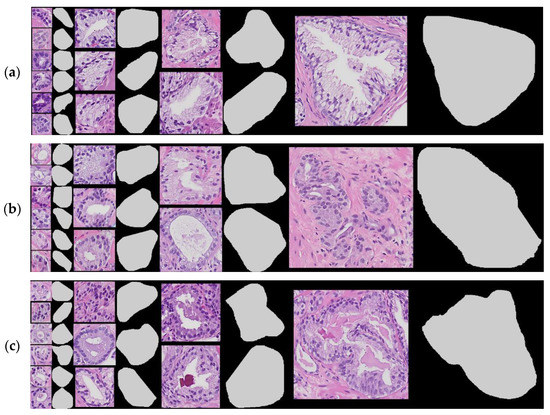 Sample selection of UM/MCC gland-level patches using the tight bounding-box technique paired with corresponding mask layer (on the right): (a) samples of benign, (b) samples of GS3, and (c) samples of GS4.