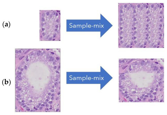 A necessary step in preprocessing the data was to ensure the image patches were identical in size prior to being processed through the DL CNN. There have been many resizing techniques that were tried previously such as in [39,40], cropping to fixed size areas (or loose bounding boxes) around the areas of interest, such as the glands. In our study, we adopted a sample-mix approach, which was inspired by other image mixing techniques such as in [41,42,43]. The approach preserves the scale and the aspect ratio of textural features; see sample in Figure 4. The tiled approach allows smaller and larger images to be adjusted to the same size, preserving their original textural characteristics, immaterial of the gland size (small or large). It is possible to construct sample-mixed patches for any dimension and rank, where rank is the number of tiles sampled along each axis. The examples show a target dimension of 300 × 300 pixels and rank of three tiles (along the horizontal and vertical), requiring the sampled tiles to be 100 × 100 (or 1/9 of the target size).