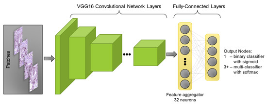 Most DL models that are studied with CNN feature layers combine with a binary or multiclass dense classification layer. Common techniques such as dropout, pooling and batch normalization were used between layers to improve performance [58,59,60]. The fully connected classification layer has a 32-node layer to aggregate features from the CNN, followed by as many neurons as are required for the classification task (1 for binary classification, or 3+ for multi-classifier), as shown in Figure 7.