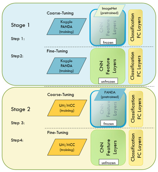 Transfer learning is very effective at jumpstarting NN training, especially when data are limited. The UM/MCC cohort is relatively small; hence, we began training by initializing a VGG-16 network on ImageNet feature weights, a popular approach shortly following the original AlexNet [27,63]. We started by coarse tuning the fully connected (FC) classification layers with the UM/MCC data and followed by fine tuning the CNN feature layers and FC layers. We improved the results by first training on a larger Kaggle PANDA Radboud dataset (both a coarse tune followed by a fine tune to train the CNN feature weights), then fine tuning with data in our own UM/MCC cohort. The NN learner goes through four stages of learning, as shown in Figure 8. The technique of pretraining on one dataset and then tuning on another is a common and effective transfer-learning approach. A recent study corroborates this method when used for prostate pathology grading [64].