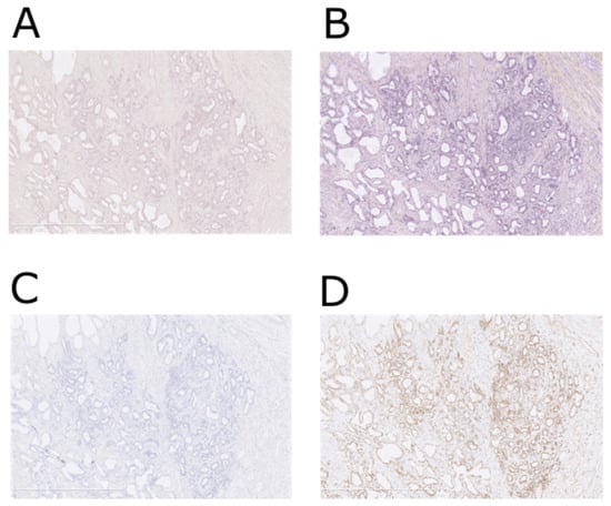 Example of a prostatic ISUP-2 sample (HES staining in (A)) negative for PSMA (B) and GRP-R (C) immunohistochemistry, but with positive staining for NTS1 immunochemistry (D). Images were taken at 10× magnification.