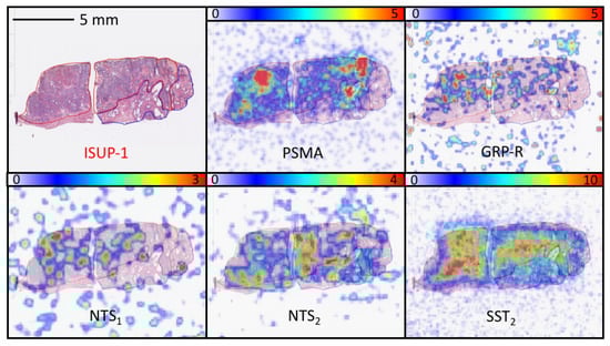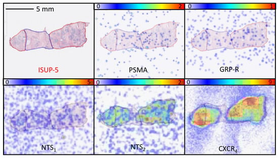 With this in mind, we performed a retrospective micro-imaging study comparing PSMA, GRP-R, NTS1 as well as NTS2, SST2 and CXCR4 expression using specific radiopharmaceuticals that would be more representative of in vivo behavior. Overexpression of the NTS2 receptor in prostate cancer has been reported; an in vitro study has assessed the potential use of the NTS2 receptor as a target by analyzing its expression patterns in human prostate cell lines and primary prostate cell cultures—NTS2 was found in cells with luminal phenotype []. Other studies are needed to confirm these results. SST2 is also overexpressed in prostate cancer—especially in cases of neuroendocrine differentiation [,]. CXCR4 overexpression has also been reported in prostate cancer; studies have shown that CXCR4 is a key regulator of tumor dissemination []. An in vitro study comparing adjacent normal endothelial cells to prostate tumor vasculature highlighted CXCR4 as a potential novel target to interfere with prostate cancer angiogenesis [].