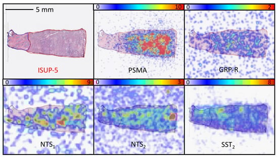 Comparison of the binding between PSMA, GRP-R, NTS1, NTS2 and SST2-specific radiopharmaceuticals on an ISUP-5 sample. The red line drawing on HES slice corresponds to the tumor area. Specific binding = 45% for PSMA, 40% for NTS1, 95% for NTS2 and 40% for SST2. Specific binding was not available for GRP-R due to technical issues. Color scale refers to cps/mm².