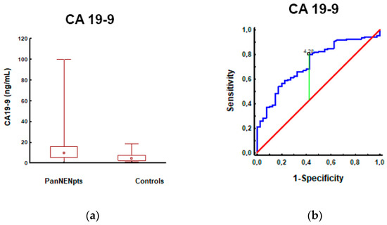 CA19-9 levels in patients with PanNEN and controls: (a) CA19-9 measurements were significantly higher in patients with PanNEN (12.89 ± 14.66; 9.43; n = 106) compared to controls (5.60 ± 4.46; 4.10; n = 63) (p < 0.001); (b) The AUROC for CA19-9 levels in patients with PanNEN and controls: the AUROC (red line) for differentiating patients with PanNEN from controls was 0.73 (95%CI: 0.64–0.82; (p < 0.001). A maximum AUC = 1 identifies an ideal (perfect) differentiation between disease and non-disease subjects. The diagonal line (AUC = 0.5) corresponds to chance discrimination. The CA19-9 AUC > 0.7 (red line) indicates that it is a fair biomarker for patients with PanNEN.
