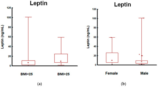 Sex was included in the analysis as an additional factor differentiating PanNEN patients. Comparing anthropometric and biochemical parameters in the PanNEN patients depending on the sex showed that females tended to have a higher leptin level than males (p = 0.013) (Figure 2b). The sex of the PanNEN patients did not affect the other serum biomarker concentrations such as CA19-9, CEA, and CgA (Table S7 of the supplementary materials).