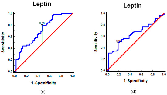 Leptin in patients with PanNEN according to BMI and sex: (a) Mann–Whitney test. Leptin in PanNEN patients with normal BMI and elevated BMI: measurements of the leptin identified elevated levels in patients with PanNEN with BMI ≥ 25 kg/m2 vs. BMI < 25 kg/m2 (p < 0.001); (b) Mann–Whitney test. Leptin in patients with PanNEN according to the sex: measurements of the leptin identified elevated levels in patients with PanNEN: female vs. male (p = 0.013); (c) the AUROC for leptin levels in patients with PanNEN with BMI ≥ 25 kg/m2 and BMI < 25 kg/m2. The AUROC (blue line) for differentiating patients with PanNEN with BMI ≥ 25 kg/m2 from BMI < 25 kg/m2 was 0.71 (95%CI: 0.61–0.80. p < 0.001); (d) the AUROC for leptin levels in patients with PanNEN: female and male. The AUROC (blue line) for differentiating females and males was 0.64 (95%CI: 0.54–0.75. p = 0.008).