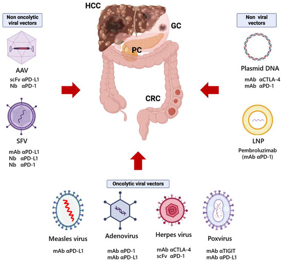 Viral vectors are the most commonly used delivery vehicles in pre-clinical and clinical settings due to their remarkable gene delivery efficiency [97], although their use raises some concerns regarding their safety, pre-existing antibodies, poor packaging capacity, and high production costs [98,99,100]. Non-viral vectors are also under active investigation since they present a more favorable safety profile, can deliver larger genetic payloads, and are typically easier and less expensive to produce than viral vectors. However, their gene transfer efficiency, specificity for the target cells, and duration of gene expression are usually lower than those of viral vectors [101]. Several types of viral and non-viral vectors able to express ICIs have been tested in different preclinical models of GI tumors with promising results (Figure 1).