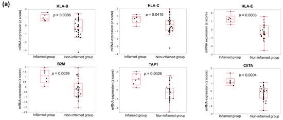 Comparisons of mRNA expression and DNA methylation level between inflamed and non-inflamed cholangiocarcinoma. mRNA expressions of the genes involved in antigen presentation are significantly higher in inflamed group than in non-inflamed group for all comparisons (a). Similarly, their DNA methylation levels are significantly lower in inflamed group than in non-inflamed group for all comparisons (b). Red boxes and whisker plots denote 75% and 95% distribution, respectively, and the red lines in the boxes show the median values. p values by non-parametric Wilcoxon rank-sum test are shown.
