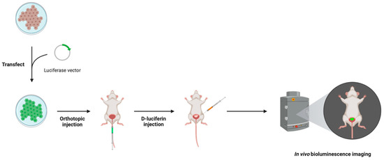 Bioluminescence imaging (BLI) method in an intravesical murine model of BCa, where a BCa cell line is transfected with a luciferase vector that is subsequently inoculated into the bladder wall of the murine model. The D-luciferin substrate is administered via intravascular or intraperitoneal injection 10–18 min prior to visualization to stimulate the reporter system. Visualization occurs using an in vivo imaging system that detects the emission of green light when luciferase converts D-luciferin to oxyluciferin. Figure prepared with BioRender (biorender.com, accessed on 1 February 2023).