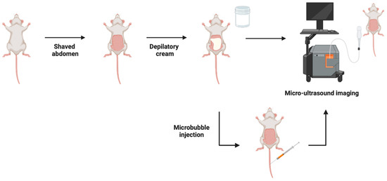 Micro-ultrasound imaging (MUI) method in an intravesical model of BCa where the abdomen is shaved, depilatory cream is applied to remove fine hairs, and high viscosity ultrasound gel is utilized during imaging to enhance the image resolution. Subsequent studies administered microbubbles via intravenous injection prior to imaging for visualization and quantification of the superficial tumor vasculature. Figure prepared with BioRender (biorender.com, accessed on 1 February 2023).