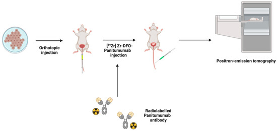 Positron emission tomography (PET) method in an intravesical murine model of BCa in which EGFR-expressing BCa cells are inoculated into the mouse bladder wall. Antibodies are conjugated and radiolabeled producing [89Zr] Zr DFO-panitumumab, which was administered intravenously, and mice were imaged 72 h later. Figure prepared with BioRender (biorender.com, accessed on 1 February 2023).