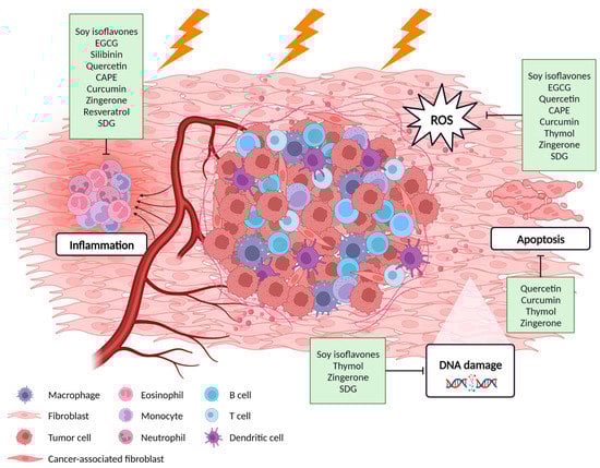 Curcumin, one of the major components of Indian turmeric (Curcuma longa), is a dietary polyphenol (Table 6) characterized for its antioxidant protective effects in normal tissue [,]. Furthermore, curcumin has also been proposed to have cytotoxic and radiosensitizing effects against different types of tumors, such as lung and cervical cancer by sensitizing cells to radiation as well as increasing apoptosis both in vitro and in vivo [,,]. Curcumin has been suggested to have radioprotective effects in the normal tissue via scavenging ROS and preventing lipid peroxidation. Preliminary in vitro results showed that curcumin reduced the fraction of apoptotic lung cells and did not sensitize them to radiotherapy, which could be explained via its antioxidant properties [,]. In mouse lung fibroblasts, curcumin has been suggested to increase antioxidant enzymes activity as well as to prevent irradiation-induced ROS formation [].
