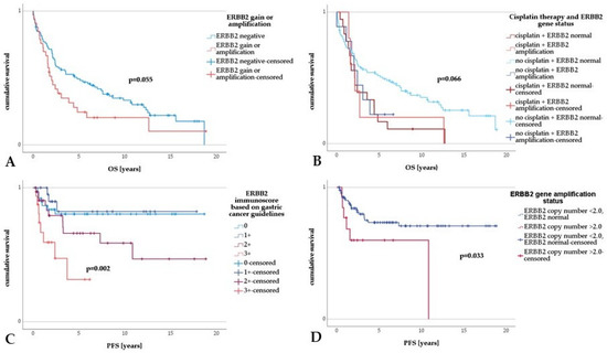 Survival analysis in upper tract urothelial carcinoma. (A) Upper tract urothelial carcinoma with ERBB2 amplification or gain displayed a trend toward shorter OS compared to UTUC without ERBB2 amplification or gain. (B) Comparing different groups, UTUC patients diagnosed with normal ERBB2 gene status and without adjuvant platin-based treatment showed a significantly longer OS. (C) There was a highly significant shorter PFS in UTUCs with ERBB2 immunoscores of 2+ and 3+ in contrast to UTUC with an ERBB2 immunoscore of 0 or 1+. (D) A significantly shorter PFS in UTUC with ERBB2 amplification compared to UTUC with normal ERBB2 gene status was revealed.