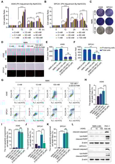 To identify the role of NMN in lung cancer cell growth under different dosing schemes, we conducted cell proliferation and inhibition experiments using various concentrations of NMN in A549 and SPCA1 cells, determined using a CCK8 assay. At low doses (10 and 20 mM) and prolonged exposure (48 h), NMN increased cell proliferation, but it induced the suppression of cell proliferation at the high dose (100 mM), as shown in Figure 1A,B. The finding was subsequently confirmed by the results of the tumor cell colony formation assay (Figure 1C). Moreover, high-dosage NMN enhanced cytotoxicity to lung adenocarcinoma cells compared with normal cells (Supplementary Figure S1). Next, we performed PI stain assay in A549 and SPCA1 cells after NMN treatment and found that high-dose NMN could promote cell death. Moreover, high-dose NMN could further promote cell death after the inhibition of the apoptotic program via the apoptosis inhibitor Z-DEVD-FMK (Figure 1D–F). The findings suggest that high-dose NMN inhibits lung cancer cell growth through a non-apoptotic form of regulated cell death. To further test the hypothesis, we performed flow cytometry analysis and found that the apoptotic- or non-apoptotic-regulated death in cells after high-dose NMN treatment was higher than that in cells after solvent treatment; the number of non-apoptotic regulated death cells was much higher than the number of apoptotic cells after high-dose NMN treatment (Figure 1G–K). We also confirmed that NMN could promote cell death after inhibiting the apoptotic program only at the high dose (Figure 1G–K). The results of Western blot analysis showed that high-dose NMN had no notable drug-induced effects on apoptosis program molecules caspase3 and PARP (Figure 1L). In addition, PARPs are not exclusively involved in apoptosis induction but also in autophagic cell death and necrosis. These results also suggest that high-dose NMN has no noticeable effects on autophagic cell death and necrosis (Figure 1L).