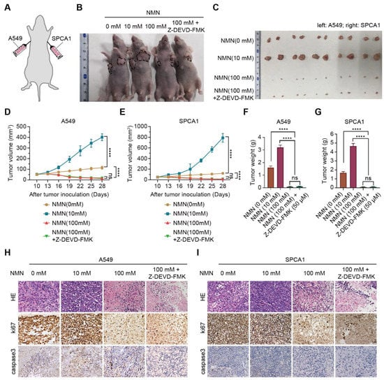 All animal experiments were approved by the Institutional Animal Care and Use Committee of Nanjing Medical University (IACUC: 2206030). The experimental BALB/c nude mice (male, 5 weeks old) were purchased from SLAC Laboratory Animal Center (Shanghai, China) and maintained in SPF facilities. To verify the effectiveness of NMN, 5 × 106/100 μL of A549 cells and 5 × 106/100 μL of SPCA1 cells were subcutaneously injected into the right and left axilla of the BALB/c nude mice, respectively. When the tumor volume (volume = length × width2/2) reached 100 mm3, the mice were randomly divided into four groups (n = 5) and were treated with solvent control, NMN (10 mM), NMN (100 mM), or NMN (100 mM) + Z-DEVD-FMK (50 mM) via intratumoral injection every 3 days. The body weight and tumor size were measured twice per week. After 4 weeks, the mice were humanely sacrificed, and the tumor weights were measured.