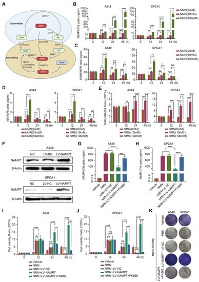 High-dosage NMN inhibits lung adenocarcinoma cell proliferation through its metabolite NAM. (A) Graphic illustration of intracellular NMN metabolism. (B–E) Concentrations of NMN metabolites NAM (B), NMN (C), and NR (D), along with the NAD+/NADH ratio (E) in A549 and SPCA1 cells after treatment with indicated concentrations of NMN, as measured using ELISA kits (n = 5). (F) Western blot analysis of NAMPT protein expression in A549 and SPCA1 cells after transfection with an overexpression of NAMPT or control lentivirus. (G,H) A549 (G) and SPCA1 (H) intracellular NAM contents were tested using ELISA kits in indicated groups (n = 5). (I,J) Cell proliferation of A549 (I) and SPCA1 (J) cells was measured using CCK8 assay in indicated groups (n = 5). (K) Representative images of colony formation for A549 and SPCA1 cells in indicated groups. * p value < 0.05; ** p value < 0.01; *** p < 0.001; **** p < 0.0001; ns, no significance.
