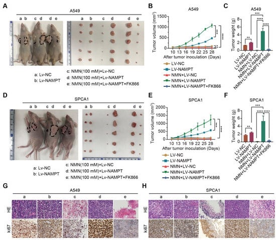To further verify that NMN works through NAMPT’s catalysis, we first generated NAMPThigh A549 and SPCA1 cells using the NAMPT-specific plasmids via lentiviral infection. Subsequently, the A549 and NAMPThigh A549 cells were subcutaneously injected into the right and left axilla of BALB/c nude mice, respectively. The mice were randomly divided into three groups (n = 5) and were treated with solvent control, NMN (100 mM), or NMN (100 mM) + FK866 (30 nM) via intratumoral injection every 3 days. The SPCA1 and NAMPThighSPCA1 cells were treated analogously to the cells in the mice model.