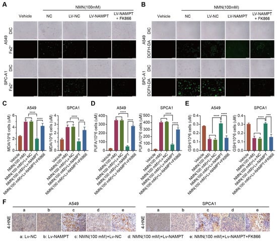 To test the hypothesis that NAM plays a key role in suppressing lung cancer growth through the ferroptosis program, we analyzed cell composition changes by detecting cellular mitochondrial ferrous ions, ROS, MDA, PUFA, and GSH after over- or low-expression NAMPT with high-dose NMN treatment. The results showed that A549 and SPCA1 cells exhibited a reduction in cellular mitochondrial ferrous ion (Figure 6A), ROS (Figure 6B), MDA (Figure 6C), and PUFA (Figure 6D) contents and an accumulation of GSH (Figure 6E) after the overexpression of NAMPT accelerated the transformation of NAM, whereas the inhibition of NAMPT reversed the process (Figure 6A–E). The results of the 4-Hydroxynonenal (4-HNE) staining of the tumor samples showed that the overexpression of NAMPT reversed the induction of the ferroptosis program by NAM after high-dose NMN treatment, whereas NAM-restored cells, combined with the NAMPT inhibitor FK866, subsequently restarted the ferroptosis program (Figure 6F). These data show that NMN induces ferroptosis via its metabolite NAM at high concentrations.