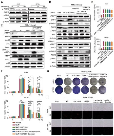 As the AMPK-mediated phosphorylation of ACC was reported to inhibit ferroptosis under energy stress [], we investigated its role downstream of high-dose NMN action as a tumor suppressor. Consecutively, the tandem activation of SIRT1 and AMPK occurs in mammalian cells, where the increased effect can be inhibited with an overload of NAM []. These studies provided a theoretical basis for studying the anti-tumor effects of high-dose NMN as a function of ferroptosis-mediated lung adenocarcinoma cell death. As shown in Figure 7A, high-dose NMN inhibited the phosphorylation of AMPK and activated its downstream target, ACC, in vitro, in a dose-dependent manner. Then, under a high-dose NMN treatment, we used the SIRT1 agonist CAY10602, SIRT1 inhibitor selisistat, AMPK agonist GSK621, and AMPK inhibitor dorsomorphin to treat the lung adenocarcinoma cells, and evaluated the NAMPT, SIRT1, p-AMPK, AMPK, p-ACC, and ACC protein expressions using Western blot analysis. The results are shown in Figure 7B. CAY10602 promoted the expression of SIRT1 and the phosphorylation levels of AMPK, while suppressing the levels of p-ACC; selisistat treatment yielded the opposite expressions. In addition, during high-dose NMN treatment, GSK621 promoted the expression of p-AMPK and suppressed the expression of p-ACC, but showed no remarkable regulation of SIRT1; dorsomorphin reversed the regulation of p-AMPK and p-ACC by GSK621. The CAY10602, selisistat, GSK621, and dorsomorphin treatment did not affect the expression of NAMPT (Figure 7B). However, the overexpression of NAMPT activated the expression of p-AMPK and inhibited the expression of p-ACC in A549 and SPCA1 cells; NAMPT inhibitor FK866 produced the opposite result (Figure 7C). Neither CAY10602, Selisistat, GSK621, nor Dorsomorphin had any effect on the intracellular NAM content (Figure 7D,E). In summary, these results show that high-dose NMN treatment can activate SIRT1–AMPK–ACC signaling mediated through an overload of NAM.