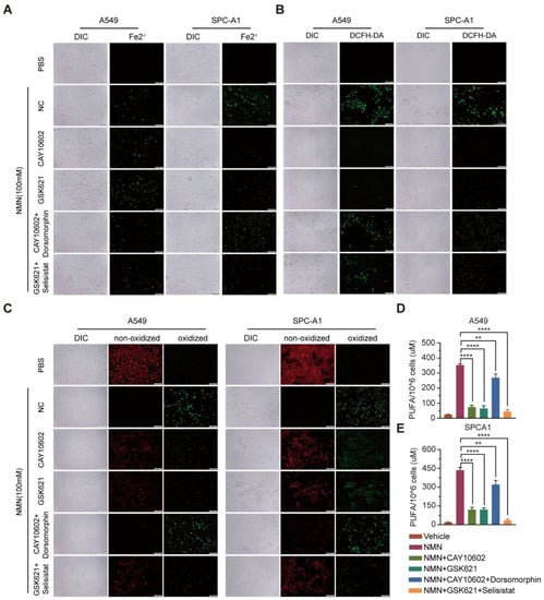 For the lipid peroxidation assay, A549 and SPCA1 cells were separately seeded with 50% confluent in confocal plates and treated with 100 mM NMN for 48 h. Then, the cells were incubated with non-oxidized C11-BODIPY 581/591 dye or oxidized C11-BODIPY 581/591 dye (MCE). After incubation at 37 °C for 30 min, the cells were imaged using a Nikon Ti microscope (Nikon, Tokyo, Japan).
