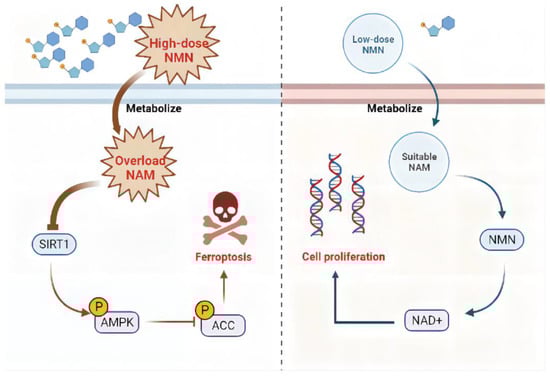 Proposed model for effects of NMN on regulating lung adenocarcinoma cell ferroptosis. In the context of high-dose NMN treatment (left), excess metabolized NAM inhibited AMPK phosphorylation by targeting SIRT1, triggering the process of ferroptosis via ACC activation pathways. In the context of low-dose NMN treatment (right), NAD+ was catalyzed in large quantities through intracellular NMN synthesized by a suitable concentration of NAM, leading to cancer cell proliferation.