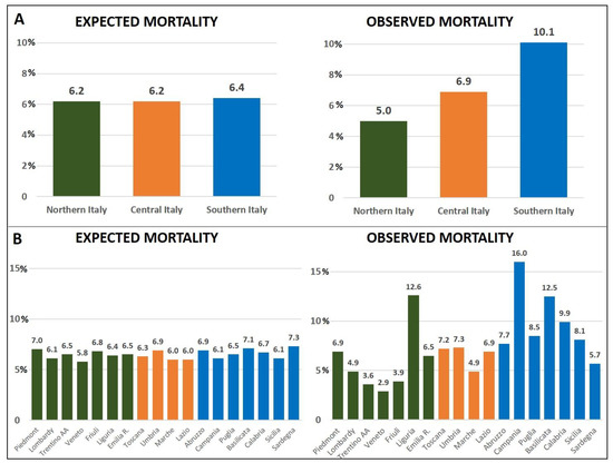 Expected and observed mortality rate according to different geographic areas (A) and regions (B).