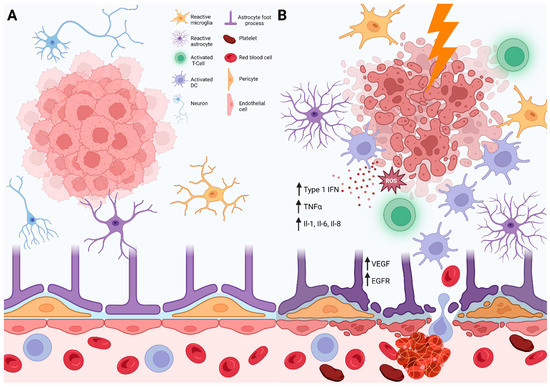 Radiation necrosis pathophysiology. (A) The tumor microenvironment of a brain metastasis prior to radiation includes a conglomerate of tumor cells surrounded by resident microglia, astrocytes, and neurons. Circulating immune cells and red blood cells are separated from the brain parenchyma by an intact blood-brain barrier made up of endothelial cells and pericytes. (B) The tumor microenvironment following radiation therapy is characterized by the upregulation of pro-inflammatory and innate immune responses. In the setting of necrotic tumor cells, reactive oxygen species (ROS), type 1 IFNs, TNFα, and interleukins are upregulated. Gliosis, with reactive astrocytes and microglia, is seen. Damage to pericytes, endothelial cells, and other resident cell populations leads to hypoxia-induced VEGF and EGFR expression. A leaky blood-brain barrier allows for migrations of macrophages, dendritic cells, and cytotoxic CD8+ T-cells into the tumor microenvironment. Hemorrhage and thrombosis are additional hallmarks of necrosis. Figure created with BioRender.com.