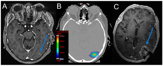 - Newman, W.C.; Goldberg, J.; Guadix, S.W.; Brown, S.; Reiner, A.S.; Panageas, K.; Beal, K.; Brennan, C.W.; Tabar, V.; Young, R.J.; et al. The Effect of Surgery on Radiation Necrosis in Irradiated Brain Metastases: Extent of Resection and Long-Term Clinical and Radiographic Outcomes. J. Neurooncol. 2021, 153, 507–518. [Google Scholar] [CrossRef]