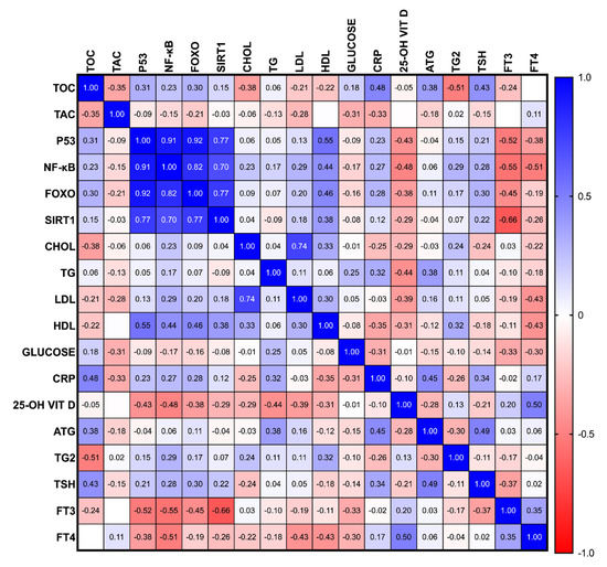 The correlation profiles of the parameters studied: FOXO, forkhead box protein O1; NF-κB, nuclear factor kappa B; p53, tumor protein 53; SIRT1, sirtuin 1; TAC, total antioxidant capacity; TOC, total oxidative capacity; CHOL, cholesterol; CRP, C-reactive protein; PTC, differentiated thyroid cancer; fT3, free triiodothyronine; fT4, free thyroxine; HDL, high-density lipoprotein; LDL, low-density lipoprotein; TG, triglyceride; TG, thyroglobulin; TGAb, thyroglobulin antibody; TSH, thyroid-stimulating hormone; 25-OH VIT D, 25-OH vitamin D.