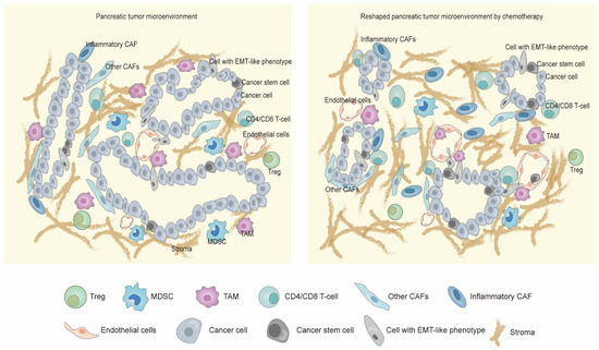 The pancreatic cancer microenvironment comprises pancreatic cancer cells, stromal cells, and immune cells. These cells undergo adaptive responses due to the stress of chemotherapy. The numbers of cancer stem cells and cells with an EMT-phenotype increase to adapt to the chemotherapeutic stress, although most tumor cells fail to survival and undergo apoptosis. Additionally, increased conventional CD4 T cells and CD8 T cells are recruited to the tumor sites with closer co-locations; meanwhile, immunosuppressive cells such as regulatory T cells, tumor-associated macrophages, and MDSCs gradually decrease due to chemotherapy. More stroma and inflammatory CAFs are associated with the remaining tumor cells supporting and chemoresistance after exposure to chemotherapy.