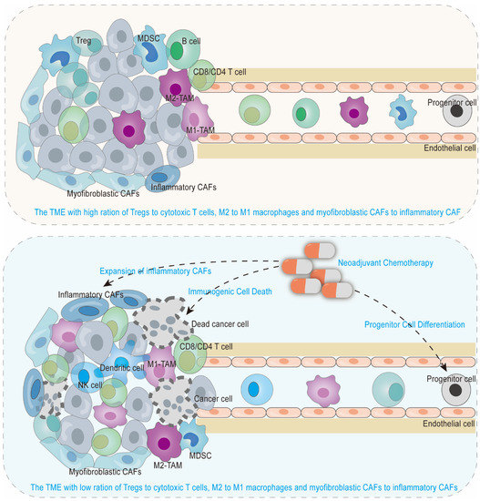 Quantitatively, numerous studies demonstrated that neoadjuvant chemotherapy could elevate cytotoxic lymphatic cell (i.e., CD8+ T cells, conventional CD4+ T cells, and NK cells) and decline immunosuppressive myeloid cells (M2-skewed cells and myeloid-derived suppressor cells) infiltration, creating an anti-tumorigenic microenvironment [10,26,28,29] and a tendency to reverse natural tumor progression in pancreatic cancer.