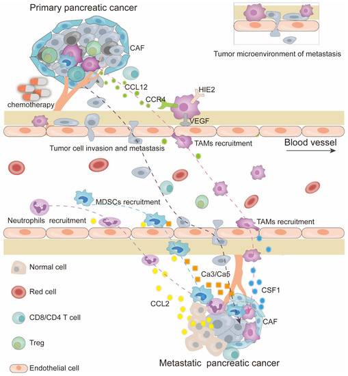 The microanatomical TME of metastasis (TMEM), which comprises a tumor cell, a perivascular macrophage, and an endothelial cell, is demonstrated to be associated with pancreatic cancer metastasis [37]. Neoadjuvant chemotherapy with paclitaxel could induce the TMEM formation and upregulate its numbers [37]. Paclitaxel transforms tumor cells into invasive ones, expressing actin-regulatory protein mammalian-enabled protein and decreasing pericyte coverage, resulting in more invasive circulating tumor cells leaking into peripheral blood. Additionally, it mobilizes bone marrow-derived TIE2+ monocyte progenitors into the TMEM, in which these immature cells transform into TIE2hi/VEGFhi macrophages [37,38]. These macrophages may be the same as the M2-skewed tumor-associated macrophages (TIE2+CXCR4hiVEGFA+) described by Hughes and colleagues [39]. These perivascular immunosuppressive macrophages and myeloid-derived suppressor cells could also be recruited by chemokine CXCL12 and granulocyte-macrophage colony-stimulating factor (GM-CSF) induced by pancreatic cancer cells treated with paclitaxel and gemcitabine/5-FU, respectively [39,40]. Tie2 inhibitor, CXCR4 inhibitor, and antibody against GM-CSF were demonstrated to be synergized with chemotherapy to reduce metastatic risk. In addition, in response to chemotherapy, TAMs and inflammatory monocytes enhance CSCs’ properties of pancreatic tumors in vivo and contribute to tumor spheroid formation in vitro by directly activating the transcription factor STAT3 [41], supporting the idea that TAMs contribute to not only the metastatic structure, but also to chemo-resistant and recurrent/metastatic cancer cells. Killing tumor cells and synchronously closing the structure may greatly reduce the pro-metastatic effect of chemotherapy.