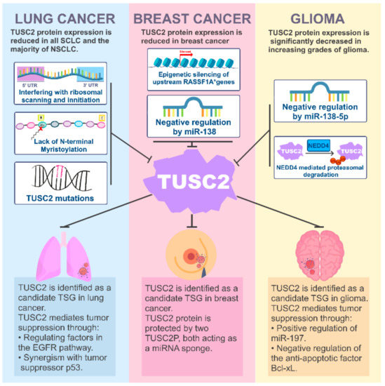 TUSC2 in Cancer. TUSC2 is a tumor suppressor lost in multiple types of cancer, including lung, breast, and gliomas. TUSC2 overexpression leads to tumor apoptosis, and decreased tumor growth, whereas TUSC2 loss promotes a more aggressive cancer phenotype across multiple cancer types.
