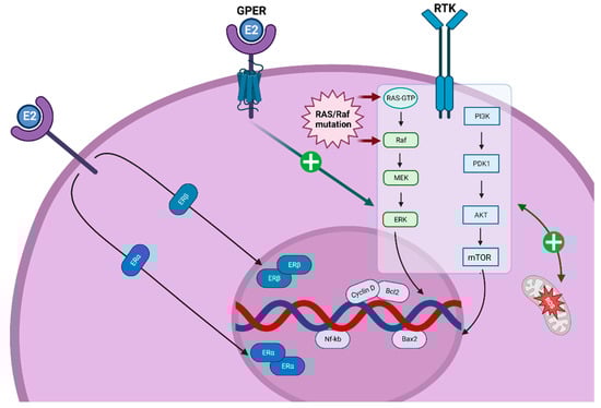 Estrogens in thyroid carcinogenesis. ER may play a role in thyroid carcinogenesis via genomic and non-genomic pathways, stimulating both the PI3K/AKT/mTOR and the RAS/Raf/MAPK pathways (as highlighted by the light blue box), and resulting in increased ROS production. These pathways are crucial in promoting cellular proliferation and differentiation. ER = estrogen receptor; GPER = G protein-coupled estrogen receptor; ROS = reactive oxygen species; RTK = receptor tyrosine kinase.