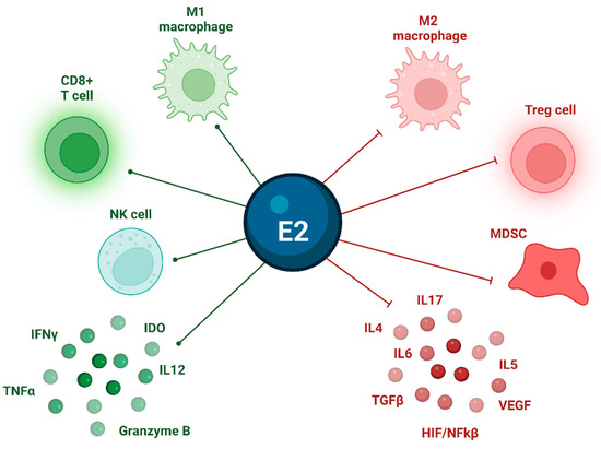 Effects of estrogenic signaling on TME in TC. E2 positive feedback (green line) induces M1 macrophages (anti-tumoral), CD8+ T cells, NK cells, and upregulates IFNγ, IL12, TNFα, Granzyme B; E2 negative feedback (red line) inhibits Tregs, MDSCs, M2 macrophages (pro-tumoral). E2 = estradiol; HIF/NFkβ = hypoxia-inducible factor/nuclear factor κβ; IDO = indoleamine 2,3-dioxygenase; IFNγ = interferon gamma; IL = interleukin; MDSC = myeloid-derived suppressor cell; NK = natural killer; TC = thyroid cancer; TGFβ = transforming growth factor beta; TME = tumor microenvironment; TNFα = tumor necrosis factor alpha; Tregs = T regulatory cells; VEGF = vascular endothelial growth factor.