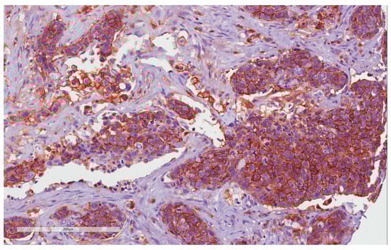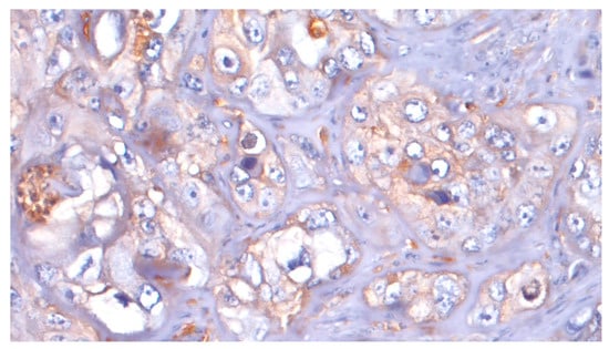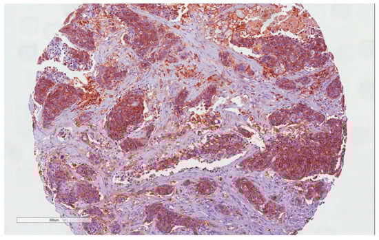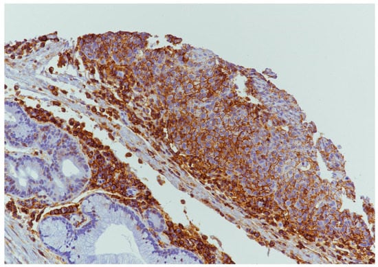 PDL1 expression was detected in 9/39 (23.0%) cases (Figure 4 and Figure 5) of which 7/9 (77.7%) cases were classified as T1–T2 stage, with no regional lymph nodal metastases at the time of diagnosis in 6 of these cases; 5/9 (55.5%) were G1–G2 grade and 4/9 (44.4%) were G3 grade. During follow-up, PDL1 expression was detected in 4/22 (18.2%) disease-free patients and in 5/16 (31.2%) patients with distant metastasis to the lung, liver, esophagus, bone, and distant lymph nodal sites. The 5-year DFS was 60% and 33.33% for negative and positive PDL1 tumors, respectively (p = 0.22; Figure 6). When stratifying the clinical data according to PDL1 expression, no significant correlations were noted (Table 2).