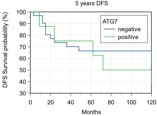 ATG7 expression was evaluable in 36 samples. With regard to ATG7 expression, 8/36 cases (22.2%) were considered L-IRS and none as H-IRS (Figure 7), and 5/8 (62.5%) of these L-IRS patients presented with an advanced stage of disease at the time of diagnosis, where 3/8 (37.5%) were G2 grade and 5/8 (62.5%) were G3 grade. During follow-up, ATG7 expression was detected in 22.7% disease-free patients and in 18.7% patients with distant metastasis, and the 5-year DFS values were 58.06% and 37.50% for negative and positive ATG7 tumors, respectively (p = 0.483; Figure 8). No significant correlations were noted after stratifying the clinical data according to the ATG7 expression.