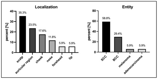 From 1 January 2015 to 31 December 2020, 17 patients (n = 17) fulfilled the inclusion criteria. All patients underwent microsurgical, free vascularized tissue reconstruction after a resection of locally advanced skin cancer in the head and neck region. All 17 patients were presented to an interdisciplinary tumor board and treatment was performed according to the tumor board’s decision. The mean age when reconstructive surgery occurred was 68.5 ± 13 years old. Eleven patients (11/17, 64.7%) were male and six patients (6/17, 35.3%) were female. The Fitzpatrick skin type was type 2 in all patients. The majority of patients (14/17, 82.4%) presented with a recurrent skin cancer and all of these patients (14/17, 82.4%) also had a history of prior skin malignancy at another localization. Three patients (3/17, 17.6%) had a history of previous malignant disease; one patient had carcinoma of the nasopharynx, another patient had non-Hodgkin’s lymphoma, and the third patient had lung cancer. Three other patients (3/17, 17.6%) received immunosuppressive medication; one patient for polycythemia vera and two patients after solid-organ transplantation.