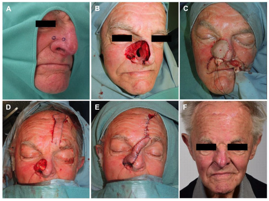 (A) Biopsies taken upon suspicious skin changes; (B) resection defect after tumor-free resection margins reached; (C) first-step reconstruction of nasal inner lining with free radial forearm flap; (D) second-step reconstruction with nasal alar reconstruction by autologous cartilage graft and (E) pedicled paramedian forehead flap; (F) follow-up result 18 months postoperatively.
