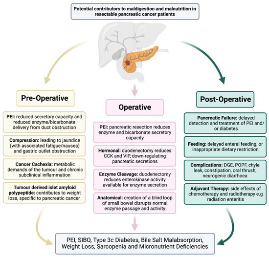 Malnutrition and maldigestion are highly prevalent in this patient population and contribute to poor outcomes. However, despite clear evidence of suboptimal care and unmet need, there is far less focus on these issues [7,8,9,10]. Perioperative malnutrition has been identified by the American College of Surgeons National Surgical Quality Improvement Program (NSQIP) as one of the major modifiable risk factors associated with poor surgical outcomes, including mortality after surgery [11,12]. Malnutrition is present in a fifth of patients before pancreatoduodenectomy (PD) [9] and increases during inpatient stay, to greater than 75% [8]. The underlying cause is multifactorial, with pancreatic exocrine insufficiency (PEI) playing a major role. Figure 1 summarises the causes of malnutrition and maldigestion in this patient population.