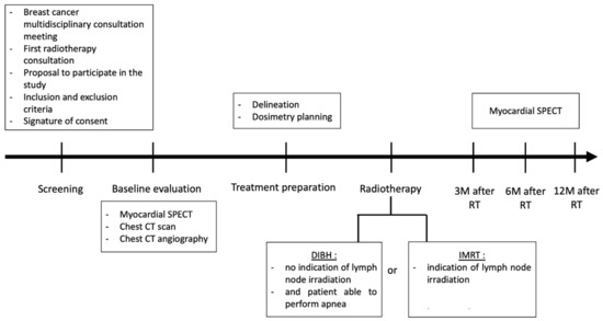 The estimation of the anticipated incidence of perfusion defects is approximately 17%. The two radiotherapy techniques evaluated (DBIH and IMRT) reduce heart exposure to irradiation. The objective of this dose reduction is to reduce the incidence of perfusion defects to 0%. Assuming an α of 0.05 and 80% power, and since two irradiation techniques are evaluated, the study should include at least 58 subjects to ensure adequate power and compensation for possible loss of patients during the protocol (Rosner B. Fundamentals of Biostatistics, 7th ed., Boston, MA: Brooks/Cole).