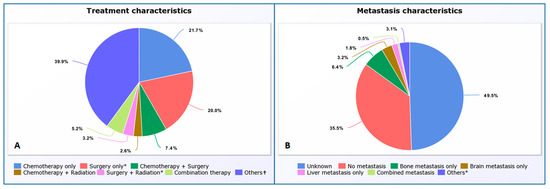 Pie Chart of Treatment Patterns (A) in PSC carcinoma and Metastasis patterns at the time of diagnosis (B); “other (* & †)” in (A,B) includes many different categories where the status of one of the treatments and pattern of metastasis are unknown.