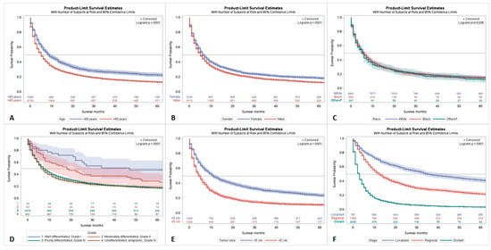Survival analysis of PSC by Age (A), Gender (B), Race (Others* = Asian or Pacific Islander, and American Indian or Alaskan) (C), Tumor grade (D), Tumor size (E), and Tumor stage (F).