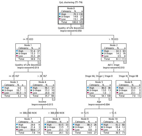 Lazarewicz MA, Wlodarczyk D, Johansen Reidunsdatter R. Decision Tree Analyses for Prediction of QoL over a One-Year Period in Breast Cancer Patients: An Added Value of Patient-Reported Outcomes. Cancers. 2023; 15(9):2474. https://doi.org/10.3390/cancers15092474