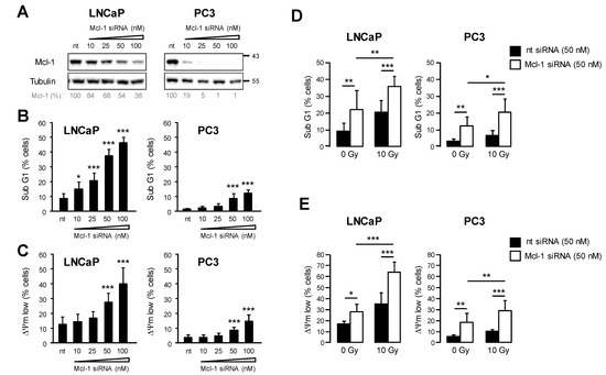 Knockdown of Mcl-1 sensitized prostate cancer cells to radiation-induced apoptosis. (A–C) LNCaP and PC3 cells were transfected with different concentrations of Mcl-1 siRNA ranging from 10 nM to 100 nM (final concentration in the medium). 100 nM non-targeting siRNA (nt) was used as control. (A) 48 h after transfection, downregulation of Mcl-1 protein level was verified by Western blot. 48 h after transfection, DNA fragmentation (B) and dissipation of mitochondrial membrane potential ΔΨm (C) were analyzed by flow cytometry. Data shows mean values ± S.D., n = 3, *: p < 0.05; ***: p < 0.001. Significance was calculated to respective cells transfected with 100 nM nt siRNA. (D,E) LNCaP and PC3 cells were transfected with 50 µM of Mcl-1 or nt siRNA. 24 h later, cells were irradiated with 0 Gy or 10 Gy. 48 h after irradiation, DNA fragmentation (D) and dissipation of mitochondrial membrane potential ΔΨm (E) were analyzed by flow cytometry. Data shows mean values ± S.D., n = 3, *: p < 0.05; **: p < 0.01; ***: p < 0.001. The original western blot images can be found in File S1.