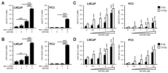 Inhibition of Bcl-2 and Bcl-xL by ABT-263 induces apoptosis in cooperation with MCL-1 knockdown and sensitizes prostate cancer cells to radiation-induced apoptosis. (A,B) LNCaP and PC3 cells were transfected with 50 nM Mcl-1 siRNA. 24 h later, cells were treated with 1 µM ABT-263 for 48 h. DNA fragmentation (sub G1, (A)) and dissipation of ΔΨm (ΔΨm low, (B)) were examined by flow cytometry. (C,D) LNCaP and PC3 cells were irradiated with 0 Gy or 10 Gy. Immediately after irradiation, cells were treated with ABT-263 at concentrations ranging from 0.4 µM to 10 µM. 48 h after irradiation, DNA fragmentation (sub G1, (C)) and dissipation of ΔΨm (ΔΨm low, (D)) were analyzed by flow cytometry. Data shows mean values ± S.D., n = 3, **: p < 0.01; ***: p < 0.001. Significance was calculated to respective solvent-treated cells (0 µM ABT-263) until otherwise indicated.